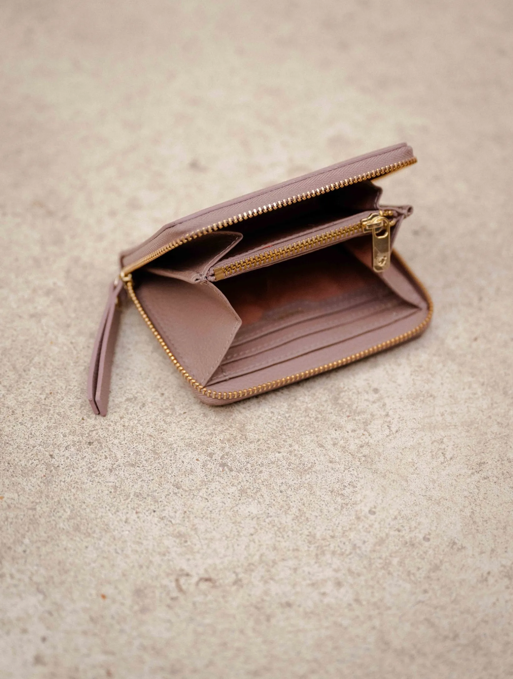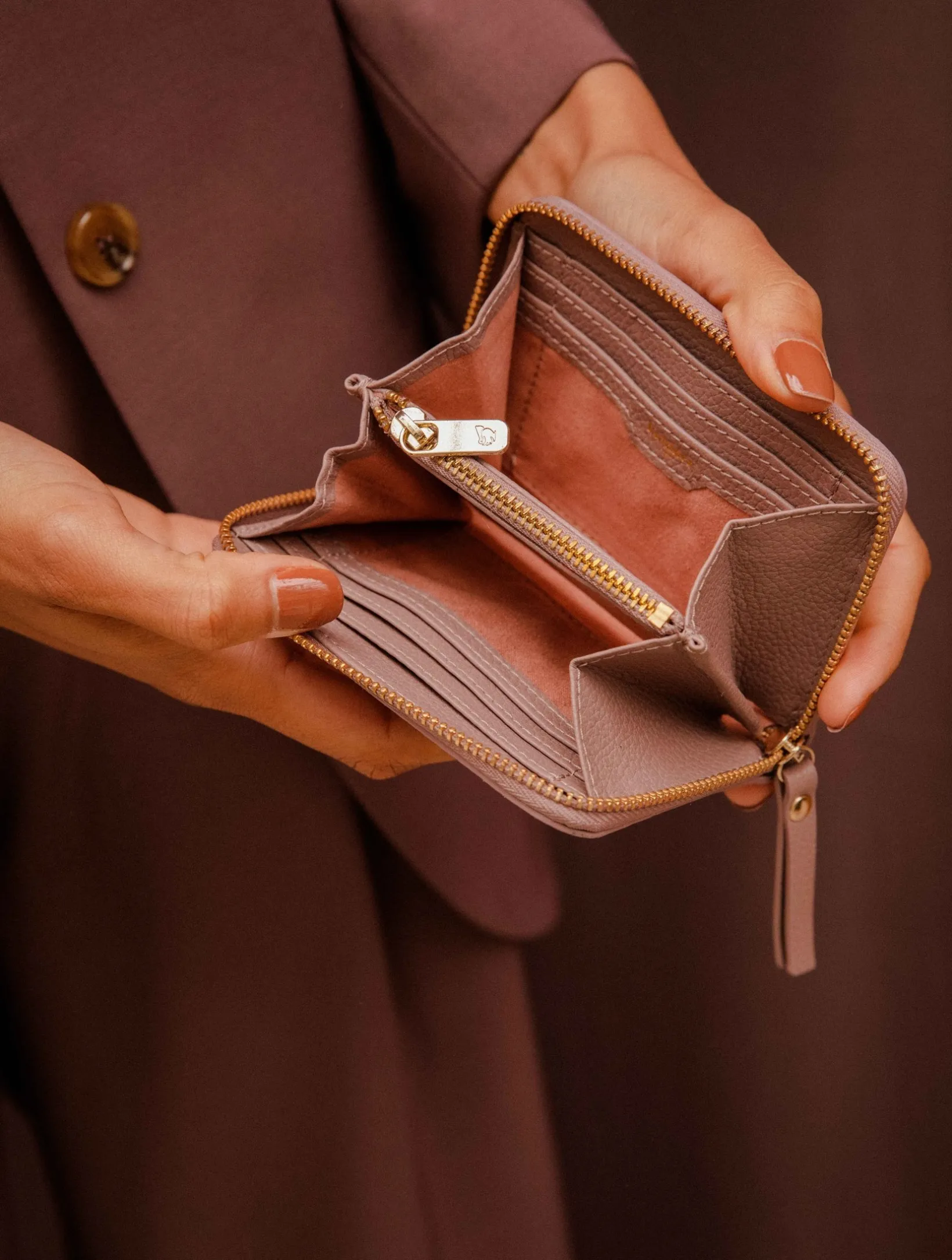 – Inside: 1 central zipped pocket, 4 credit-card-sized compartments, 2 ID-card-sized compartments