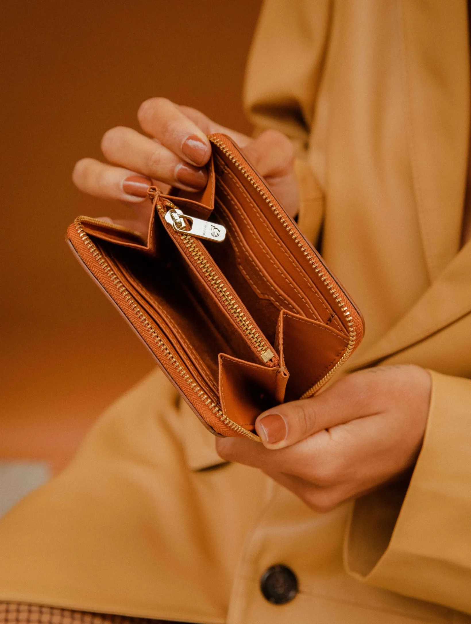 – Inside: 1 central zipped pocket, 4 credit-card-sized compartments, 2 ID-card-sized compartments