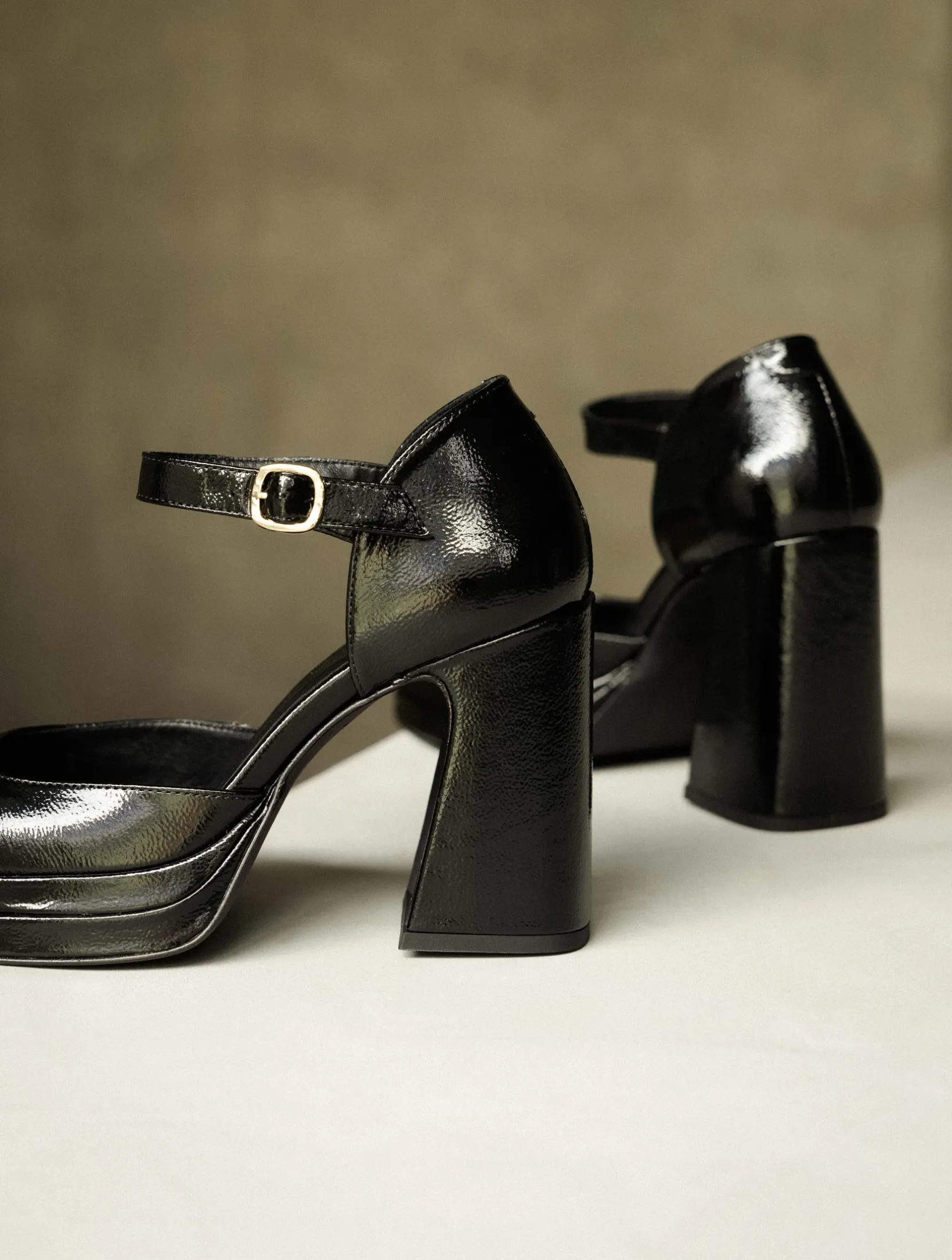 – Wrapped heel and platform in crinkled patent leather